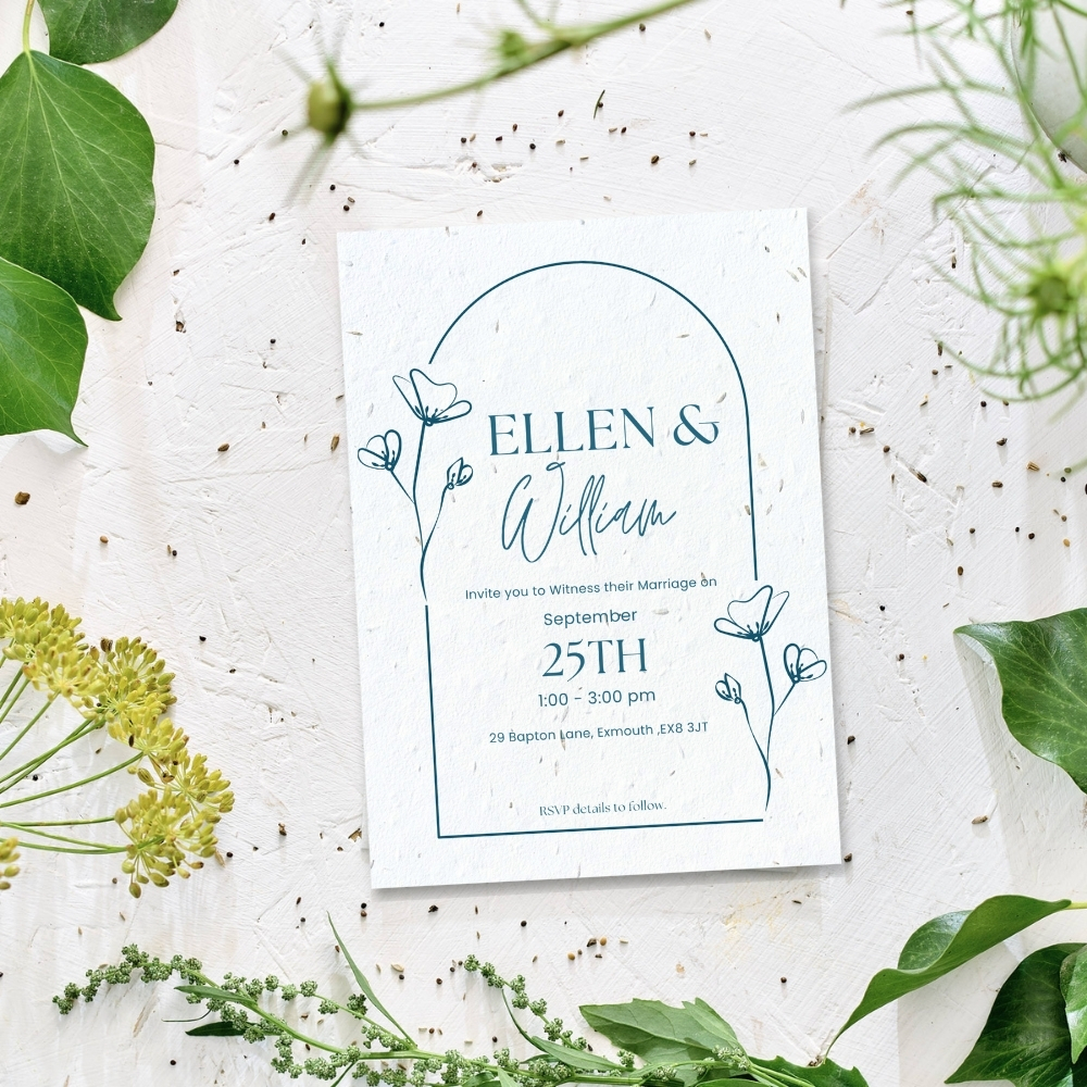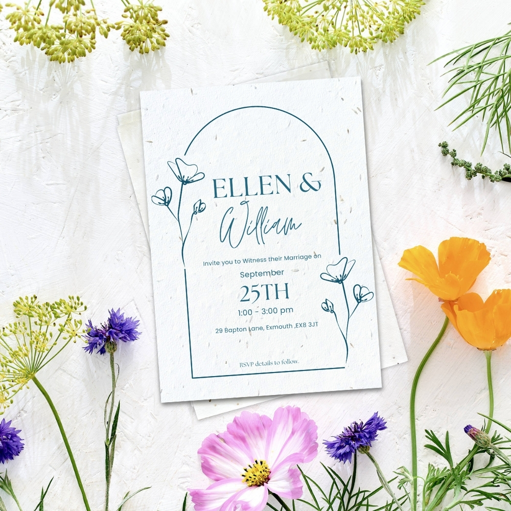You’ll receive beautifully printed wedding invitations on our UK-made plantable seed paper, personalised with your wedding details using the template design shown.