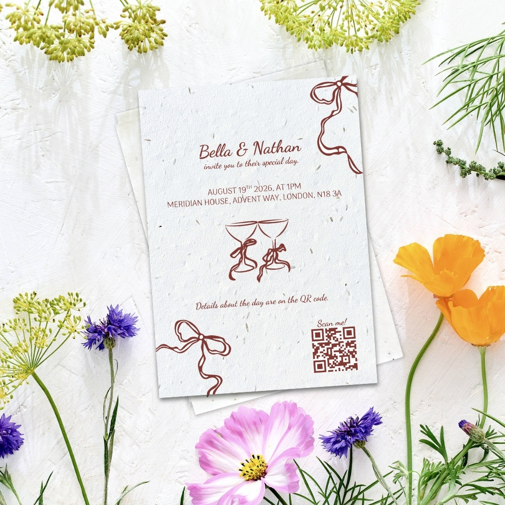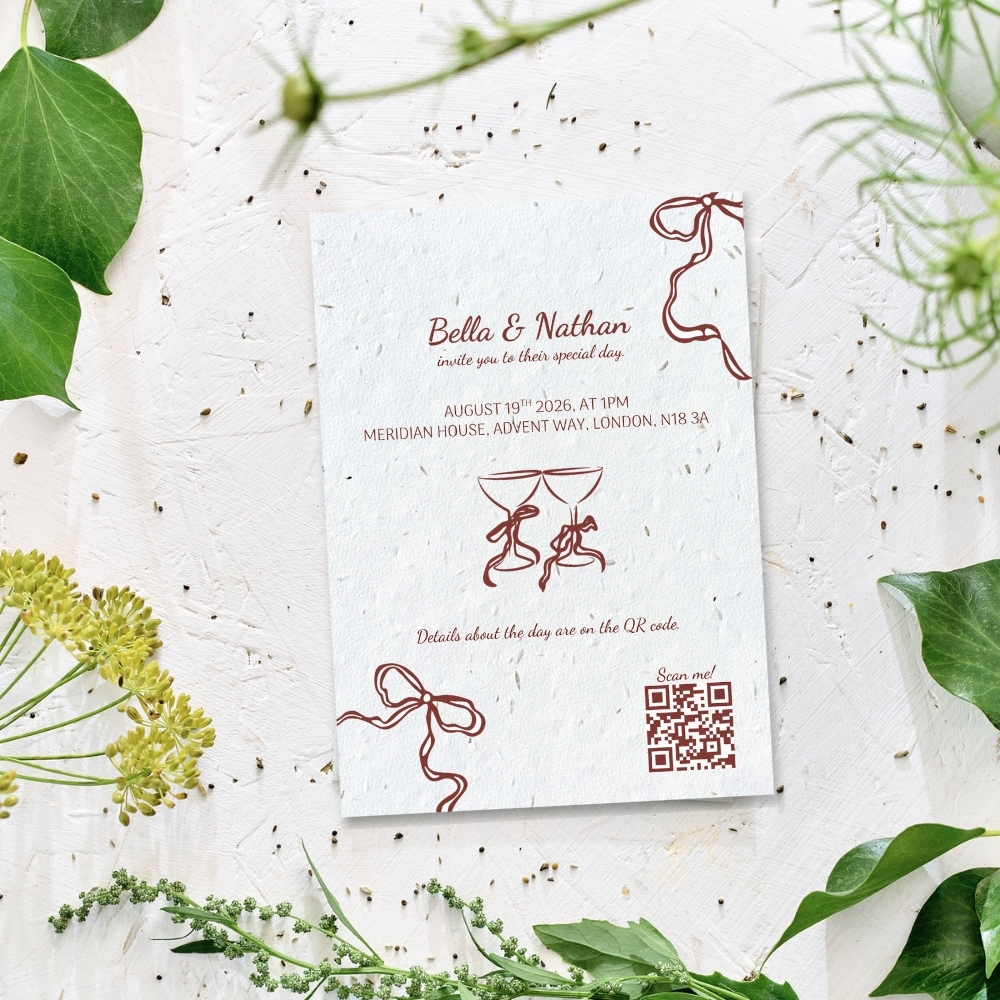 Beautifully designed wedding invites, personalised for you and printed on our signature UK-made 280gsm plantable seed paper. A simple, planet-friendly way to invite your guests.